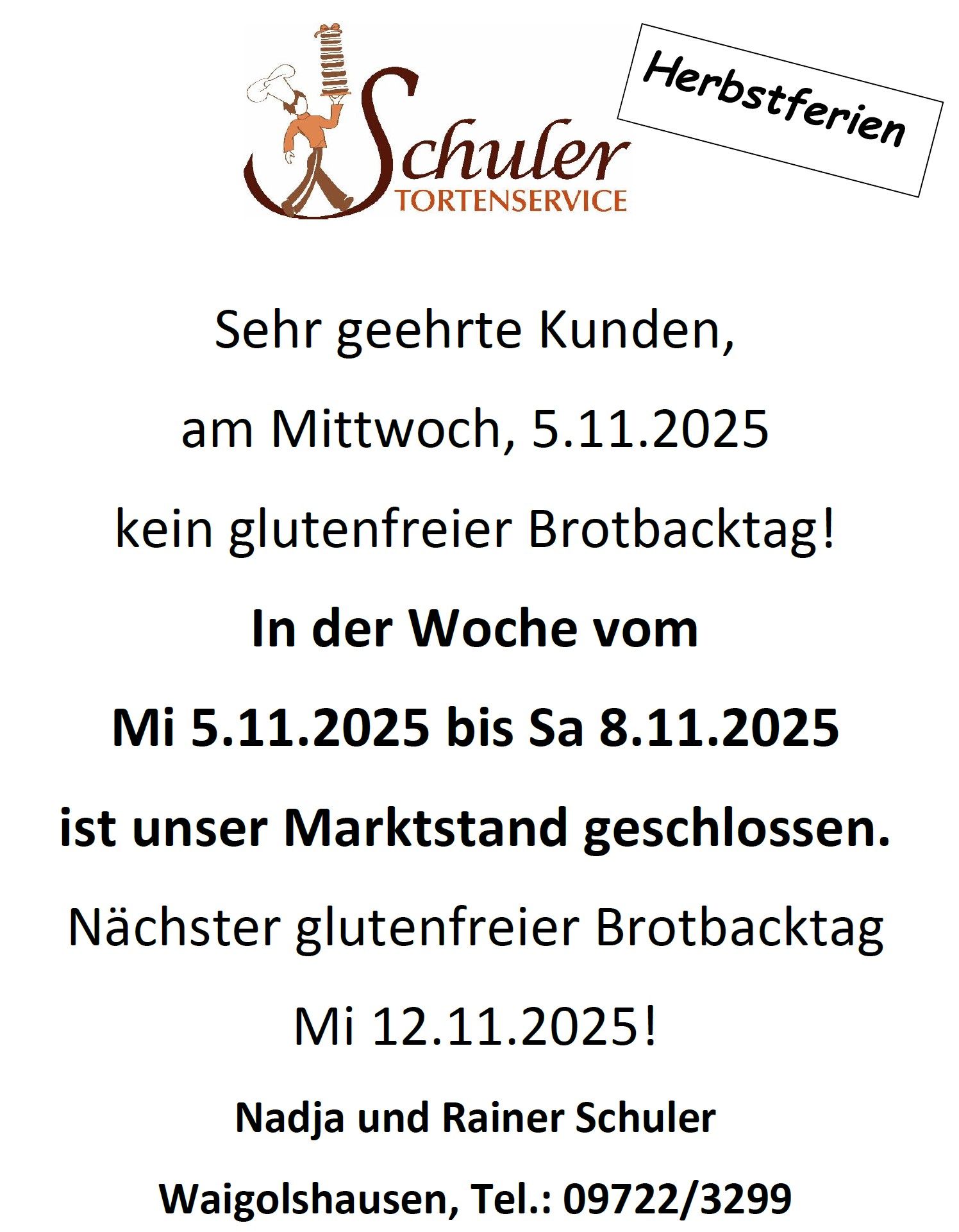 Der glutenfreie Brotbacktag ist Mittwoch. Wir bitten um Vorbestellungen glutenfreier Produkte bis Montag 17:00 Uhr.